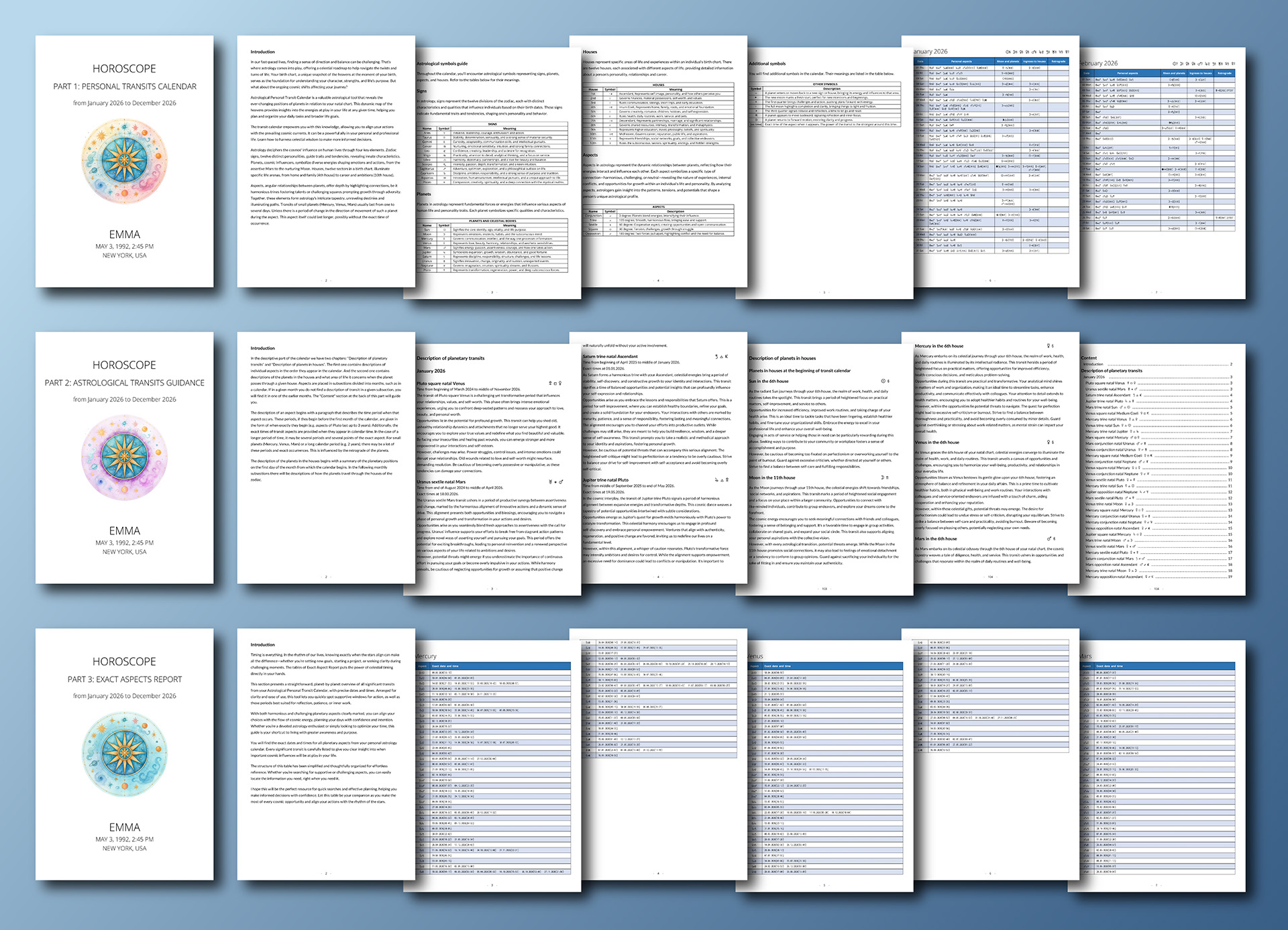 Plan launches, conversations, and travel with a Personal Transit Calendar (Part 1), supported with Transits Guidance (Part 2) and choose the best timing with Exact Aspects Report (Part 3)—personalized to your birth data.